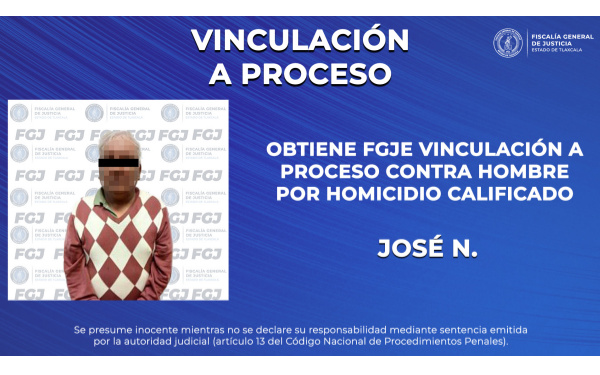 385 Grados / FGJE / REDACCIÓN / Derivado del trabajo realizado por el Ministerio Público, la Fiscalía General de Justicia del Estado (FGJE) obtuvo la vinculación a proceso en contra de José N., por el delito de homicidio calificado, cometido en el municipio de Chiautempan.
