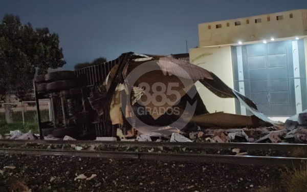 385 Grados / Vías de Mena / Alexis P. González / Un tráiler cargado de brócoli fue embestido esta madrugada por una locomotora en las vías de Mena, sobre la carretera Apizaco-Tlaxco. El accidente, que solo dejó daños materiales, causó que la caja del tráiler se partiera y su mercancía quedara regada por la zona.