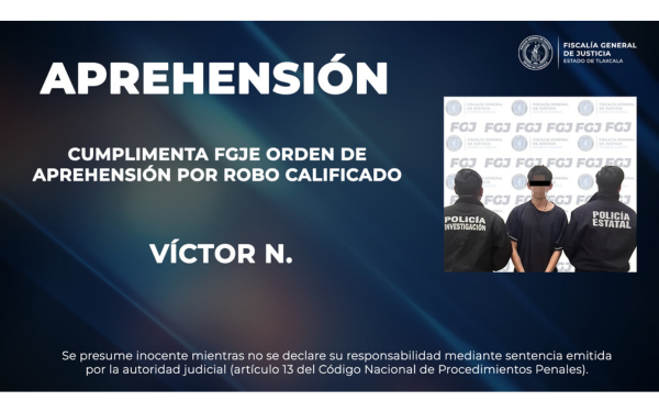 385 Grados / FGJE / READACCIÓN / Agentes de la Policía de Investigación de la Fiscalía General de Justicia del Estado (FGJE) cumplimentaron una orden de aprehensión en contra de Víctor N., por el delito de robo calificado, toda vez que fue declarado sustraído de la acción de la justicia al no comparecer a una audiencia.