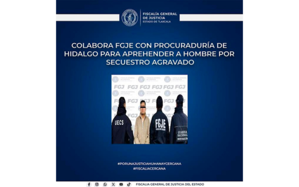 385 Grados / FGJE / REDACCIÓN / La Fiscalía General de Justicia del Estado (FGJE) colaboró con la Procuraduría General de Justicia del Estado de Hidalgo (PGJEH) para aprehender a Juan Carlos N., por su presunta responsabilidad en el delito de secuestro agravado.