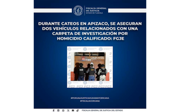 385 Grados / FGJE / REDACCIÓN / La Fiscalía General de Justicia del Estado (FGJE), a través de la Policía de Investigación, ejecutó de manera simultánea dos órdenes de cateo en el municipio de Apizaco, donde aseguró dos vehículos relacionados con una carpeta de investigación por el delito de homicidio calificado.