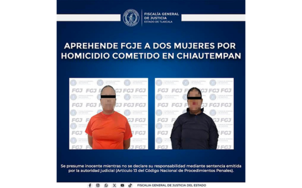385 Grados / FGJE / REDACCIÓN / Las investigaciones de inteligencia realizadas por la Policía de Investigación de la Fiscalía General de Justicia del Estado (FGJE) permitieron la detención de Lizbeth N. y Lesly N., por el delito de homicidio calificado, ocurrido en el municipio de Chiautempan.