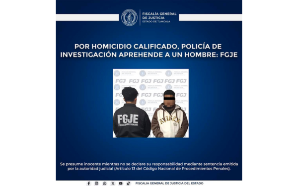 385 Grados / FGJE / REDACCIÓN / Derivado de labores de inteligencia realizadas por la Policía de Investigación, la Fiscalía General de Justicia del Estado (FGJE) aprehendió a Carlos N., por su presunta responsabilidad en el delito de homicidio calificado, ocurrido en el municipio de Tetlanohcan.