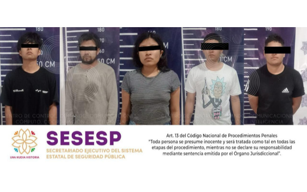 Las personas aseguradas fueron identificadas como Marco Antonio N., de 26 años; Aldo N., de 19 años; Monserrat N., de 21 años; Carlos N., de 23 años; y Víctor Adán N., de 26 años, todos originarios del estado de Puebla. Cada uno fue puesto a disposición de la autoridad competente, la cual continuará con la investigación para determinar su presunta responsabilidad.