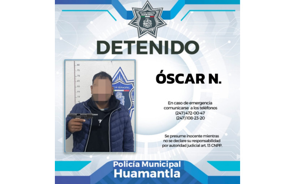 Elementos de la Dirección de Seguridad Pública de Huamantla detuvieron a un hombre, identificado como Óscar N., quien portaba un arma de fuego sin poder acreditar su legal posesión.