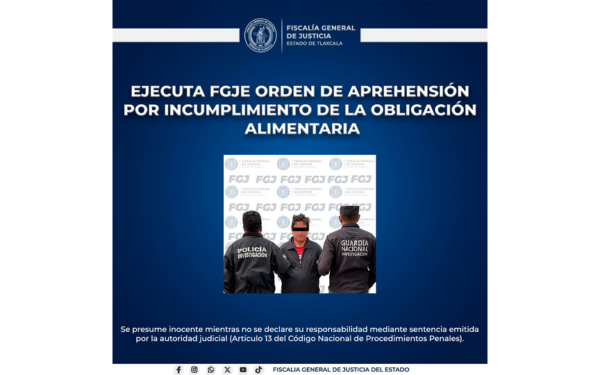 385 Grados / Tlaxcala / REDACCIÓN / Elementos de la Policía de Investigación adscritos a la Fiscalía General de Justicia del Estado (FGJE) ejecutaron una orden de aprehensión en contra de Adán N., por el delito de incumplimiento de la obligación alimentaria.