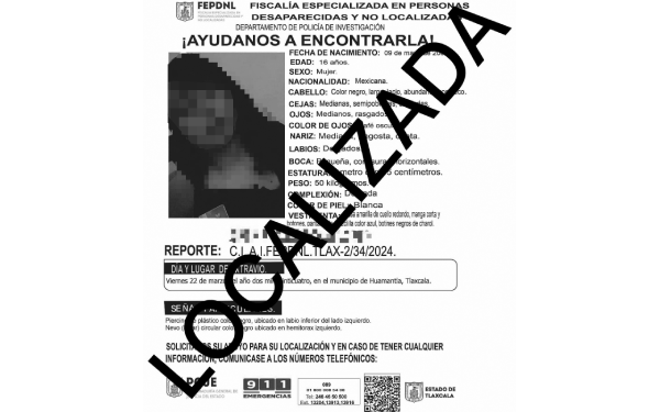 Derivado de la denuncia presentada por familiares de la adolescente, quien fue vista por última vez en el municipio de Huamantla, agentes de Investigación realizaron las labores de búsqueda correspondientes; sin embargo, la menor se presentó en las instalaciones de la Fiscalía, donde le solicitaron que los acompañara ante el representante social, a fin de dar de baja su ficha de búsqueda.