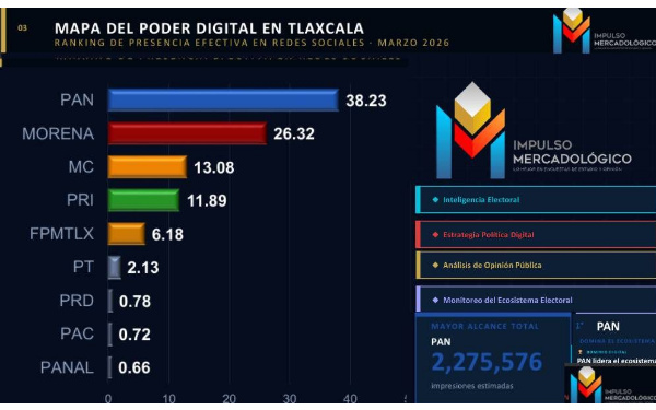 385 Grados / PAN / REDACCIÓN / El Partido Acción Nacional (PAN) se mantiene como la principal fuerza en el ecosistema digital político de Tlaxcala, al conservar el mayor nivel de alcance y presencia en redes sociales durante marzo de 2026.