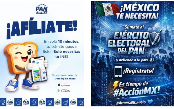 Con mensajes como “México te necesita” y “Afíliate”, el partido hace un llamado directo a la ciudadanía para integrarse tanto a su “ejército electoral” como a sus filas formales. La iniciativa persigue dos objetivos centrales: capacitar y reclutar personas para la defensa del voto y la organización electoral, además de ampliar su base de militantes, detalló el dirigente estatal panista Ángelo Gutiérrez Hernández.