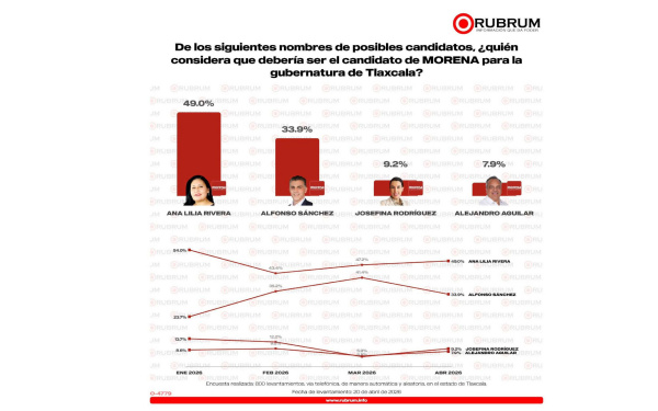 385 Grados / Ana Lilia Rivera / REDACCIÓN / De realizarse hoy la elección para la gubernatura de Tlaxcala, la senadora Ana Lilia Rivera Rivera y el partido Morena obtendrían la victoria con una amplia ventaja, de acuerdo con una encuesta de Rubrum levantada el 20 de abril.