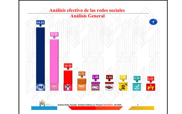 De acuerdo con el estudio, correspondiente a noviembre de 2025, el PAN encabeza el análisis general con 44.83 puntos, resultado que lo coloca como líder absoluto en alcance, interacción y presencia dentro de las plataformas digitales.
