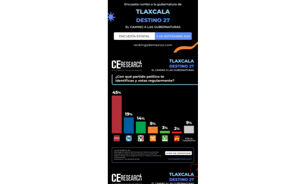 385 Grados / PAN / REDACCIÓN / De acuerdo con la más reciente encuesta estatal “Destino 27” elaborada por CE Research, el Partido Acción Nacional en Tlaxcala registra un 19% de identificación y voto regular, consolidándose como la segunda fuerza política en el estado y marcando un crecimiento sostenido rumbo a las elecciones de 2027.