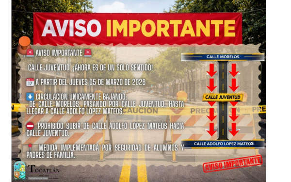 385 Grados / Tocatlán / REDACCIÓN / El H. Ayuntamiento de Tocatlán emitió un aviso a la ciudadanía para informar que, a partir del jueves 5 de marzo de 2026, la Calle Juventud cambiará su circulación a un solo sentido, como parte de las acciones para fortalecer la seguridad vial en la zona escolar.