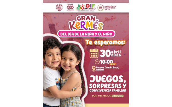 385 Grados / Apizaco / REDACCION / El Gobierno Municipal de Apizaco, a través del Sistema DIF y la Dirección de Desarrollo Social, anunció la realización de la Gran Kermés del Día de la Niña y el Niño, un evento dedicado a promover la convivencia familiar y el bienestar de la niñez.