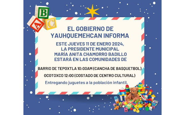 Chamorro Badillo entregará juguetes a las 10:00 horas en la cancha de básquetbol el Barrio de Tepoxtla y a las 12:00 horas a un costado del Centro Cultural de Ocotoxco.