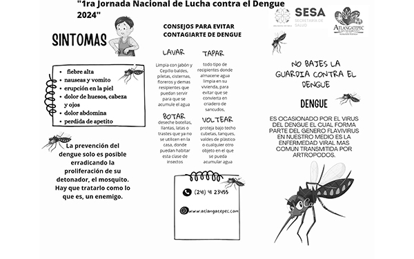385 Grados / Atlangatepec / REDACCIÓN / El gobierno municipal de Atlangatepec, apoyado por la Secretaria de Salud /Sesa), alerta a la ciudadanía en general de cómo evitar esta enfermedad que se puede combatir desde casa y es importante la suma de toda la gente, ya que en los ciudadanos está evitar la crianza del mosquito transmisor del dengue y lo podemos hacer quitando cualquier cosa que pueda almacenar agua y esté al rayo del sol, ya sea una llanta, una cacerola, una cubeta, botellas, latas abiertas, por mencionar algunos ya que estos se convierten en criaderos de del sancudo.