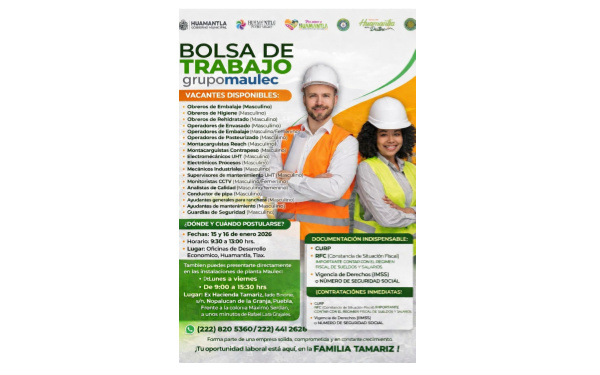 Las personas interesadas podrán postularse los días 15 y 16 de enero de 2026, en un horario de 9:30 a 13:00 horas, en las Oficinas de Desarrollo Económico del Gobierno Municipal de Huamantla, ubicadas en Bulevar Cuamanco esquina con Reforma S/N, donde se brindará atención directa y orientación sobre las vacantes disponibles.