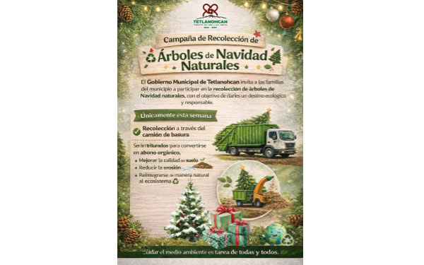 Las familias que aún conserven su árbol de Navidad natural podrán entregarlo al camión recolector de basura, ya que los árboles recolectados serán triturados para convertirse en abono orgánico, lo que permitirá mejorar la calidad del suelo, reducir la erosión y reintegrarlos de manera natural al ecosistema.
