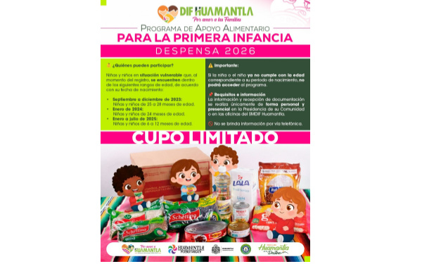385Grados / Huamantla / REDACCIÓN / El ayuntamiento de Huamantla, a través del Sistema Municipal DIF (SMDIF), invita a madres, padres y tutores de las 39 comunidades y la cabecera municipal a participar en el Programa de Apoyo Alimentario para la Primera Infancia, dirigido a niñas y niños en situación de vulnerabilidad.
