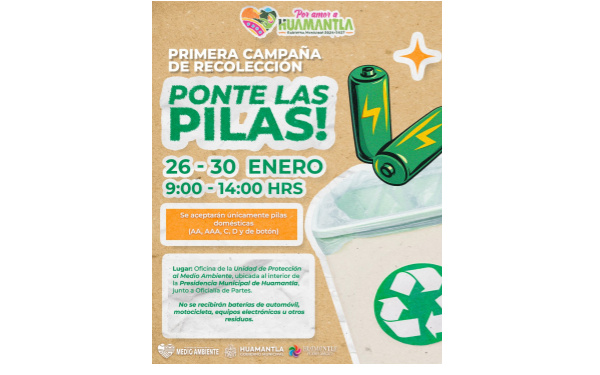 385Grados / Huamantla / REDACCIÓN / Con el objetivo de fomentar el cuidado del medio ambiente y prevenir la contaminación del suelo y el agua, el Gobierno Municipal de Huamantla, a través de la Unidad de Protección al Medio Ambiente, invita a la ciudadanía a participar en la Primera Campaña de Recolección de Pilas Usadas “Ponte las Pilas”.