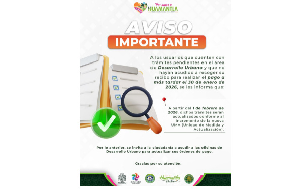 385Grados / Huamantla / REDACCIÓN / El Gobierno Municipal de Huamantla, a través del área de Desarrollo Urbano, informó a la ciudadanía que los trámites pendientes cuyo recibo de pago no fue recogido y pagado a antes del 30 de enero de 2026, serán actualizados conforme al incremento de la nueva UMA (Unidad de Medida y Actualización).
