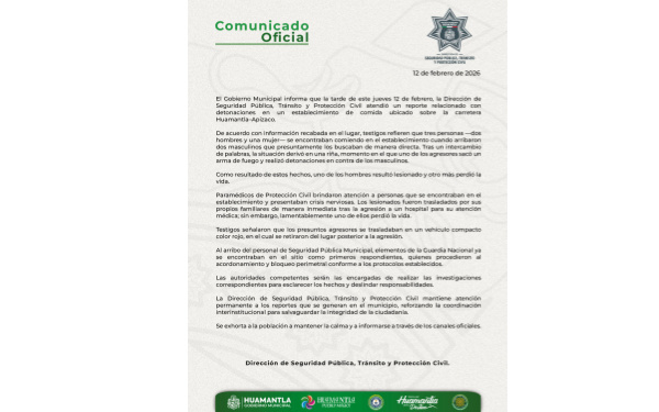 385 Grados / Huamantla / REDACCIÓN / El Gobierno Municipal informa que la tarde de este jueves 12 de febrero, la Dirección de Seguridad Pública, Tránsito y Protección Civil atendió un reporte relacionado con detonaciones en un establecimiento de comida ubicado sobre la carretera Huamantla–Apizaco.