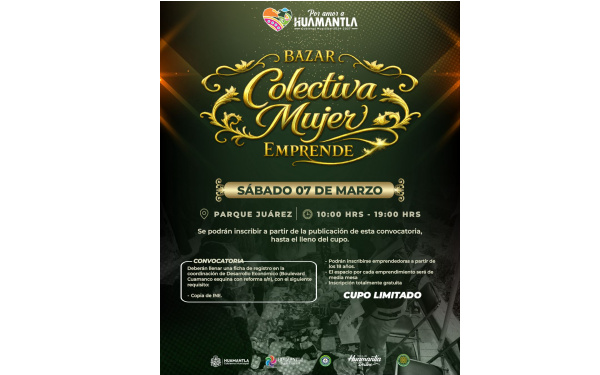 38 5Grados / Huamantla / REDACCIÓN / En el marco de las actividades conmemorativas por el Día Internacional de la Mujer, el Gobierno Municipal de Huamantla invita a todas las emprendedoras del municipio a formar parte del bazar “Colectiva Mujer Emprende”, un espacio diseñado para impulsar el talento, la creatividad y el desarrollo económico de las mujeres.