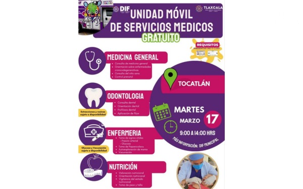 385 Grados / Tocatlán / REDACCIÒN / Con el objetivo de fortalecer la atención a la salud de la población, el Gobierno Municipal de Tocatlán, encabezado por el presidente municipal Sergio Avendaño Pérez, en coordinación con el DIF Estatal Tlaxcala y el DIF Municipal de Tocatlán, anunció la llegada de la Unidad Móvil de Servicios Médicos, la cual brindará atención gratuita a la ciudadanía.