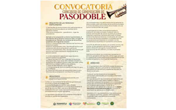 La convocatoria está dirigida a personas mayores de 18 años, quienes podrán participar con una obra original e inédita que incluya letra y música, inspirada en temas emblemáticos como “Huamantla”, “La Noche que Nadie Duerme”, “Virgen de la Caridad” o “Huamantlada”. Las composiciones deberán pertenecer al género pasodoble taurino y tener una duración máxima de seis minutos.