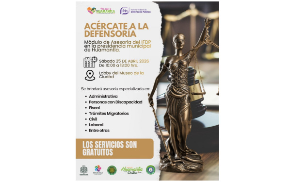385Grados / Huamantla / REDACCIÓN / Con el propósito de fortalecer el acceso a la justicia y brindar orientación legal gratuita, el Gobierno Municipal de Huamantla, en coordinación con el Instituto Federal de Defensoría Pública (IFDP), llevará a cabo una jornada de difusión de sus servicios dirigida a la población.