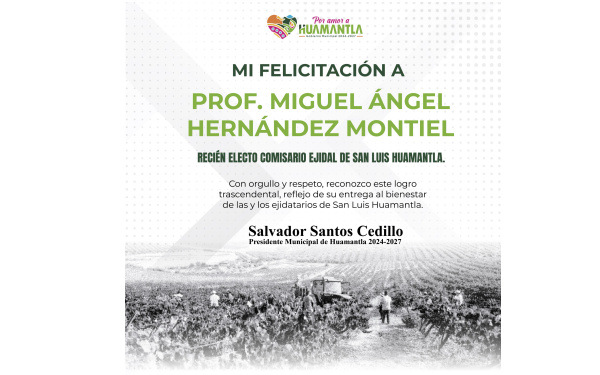 385 Grados / Huamantla / REDACCIÓN / El presidente municipal de Huamantla, Salvador Santos, felicitó al C. Miguel Ángel Hernández Montiel, quien resultó electo como nuevo comisariado ejidal de San Luis Huamantla tras una jornada democrática y participativa celebrada el pasado domingo 22 de junio.
