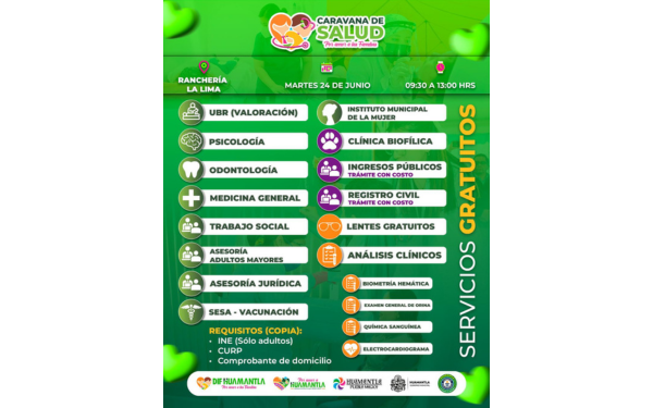 385 Grados / Huamantla / REDACCIÓN / Con el compromiso de acercar servicios y atención médica gratuita a las familias de las comunidades, el H. Ayuntamiento de Huamantla informa que este martes 24 de junio, la Caravana de Salud y Servicios visitará la comunidad de Ranchería La Lima.