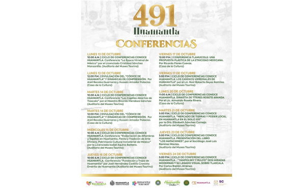 385Grados / Huamantla / REDACCIÓN / Como parte de las actividades conmemorativas por el 491 aniversario de la fundación de Huamantla, el H. Ayuntamiento, a través de la Dirección de Turismo, Cultura y Desarrollo Taurino, encabezada por el Lic. Marco Antonio Galindo Vallejo llevará a cabo un Ciclo de Conferencias que tiene como objetivo difundir el valor histórico, cultural y social del municipio, fortalecer el sentido de pertenencia y promover el diálogo entre ciudadanía y especialistas.