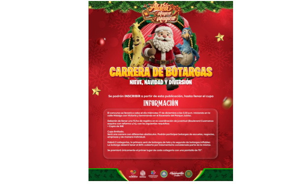 385Grados / Huamantla / REDACCIÓN / El Gobierno Municipal de Huamantla, que encabeza Salvador Santos Cedillo, a través de la Coordinación de Juventud, invita a escuelas, negocios, empresas y ciudadanía en general a participar en la tradicional Carrera de Botargas “Nieve, Navidad y Diversión”, que se realizará el miércoles 17 de diciembre a las 5:30 p.m.