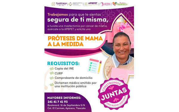 385 Grados / Huamantla / REDACCIÓN / El Sistema Municipal para el Desarrollo Integral de la Familia (SMDIF) Huamantla, en colaboración con la Administración del Patrimonio de la Beneficencia Pública del Estado de Tlaxcala (APBPET), invita a las mujeres huamantlecas que han pasado por una mastectomía debido al cáncer, a participar en el programa sin costo “Prótesis de mama a la medida”.