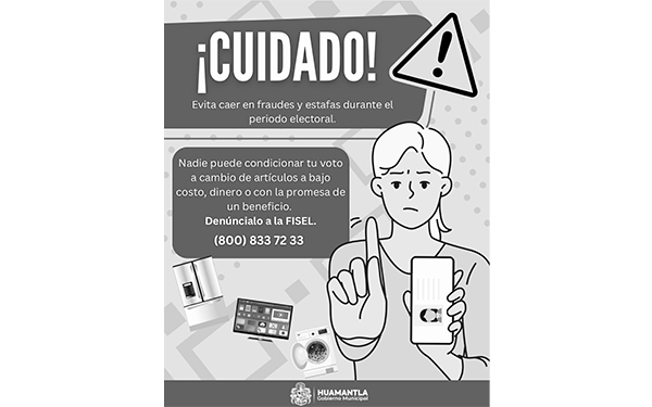 385 Grados / Huamantla / REDACCIÓN / El H. Ayuntamiento de Huamantla, a través de la Dirección de Seguridad Pública, emite un llamado a la ciudadanía en general para evitar caer en fraudes y estafas, principalmente durante este periodo electoral.