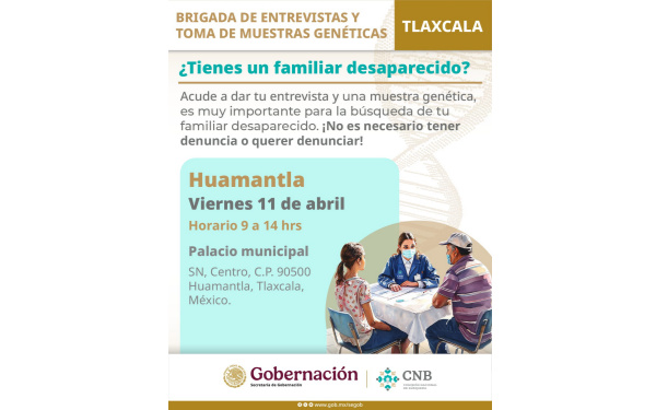 385 Grados / Huamantla / REDACCIÓN / El Gobierno Municipal de Huamantla, en colaboración con la Secretaría de Gobernación y la Comisión Nacional de Búsqueda, hace un llamado a todas las familias que tengan un ser querido desaparecido a participar en la Brigada de Entrevistas y Toma de Muestras Genéticas, que se llevará a cabo el próximo viernes 11 de abril de 2025, en el Palacio Municipal, de 9:00 a 14:00 horas.