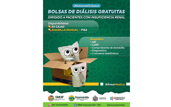385 Grados / Huamantla / REDACCIÓN / El Sistema Municipal para el Desarrollo Integral de la Familia (SMDIF) de Huamantla, a través del programa “Salvando tu Salud”, invita a la ciudadanía a adquirir bolsas de diálisis gratuitas, dirigido a pacientes con insuficiencia renal a fin de contribuir en su tratamiento y economía familiar.