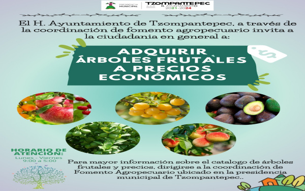 Fue a través de la Coordinación de Fomento Agropecuario que el ayuntamiento que encabeza el alcalde Manuel Ramos Montiel, hizo extensiva la invitación para que los pobladores de San Salvador y de todas las comunidades que conforman el municipio de Tzompantepec, que estén interesados en adquirir árboles frutales, acudan a la alcaldía.