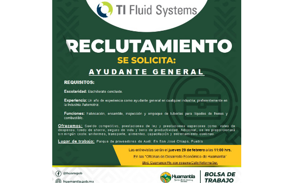 385 Grados / Huamantla / REDACCIÓN / El H. Ayuntamiento de Huamantla, que preside Salvador Santos Cedillo, en colaboración con la empresa TI Fluid Systems del ramo automotriz, anuncia que realizará un reclutamiento para contratar a personal como ayudantes generales, este jueves 29 de febrero.