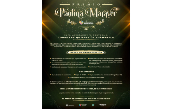 385 Grados / Huamantla / REDACCIÓN / Con el propósito de reconocer a las huamantlecas que con su trabajo y dedicación han realizado una contribución significativa al bienestar de la comunidad, destacando así su impacto positivo y alentando la participación activa del sector femenino en la sociedad, el Ayuntamiento de Huamantla, que preside Salvador Santos Cedillo, invita a las mujeres del municipio a postularse para la edición 2025 del premio “Paulina Maraver”.