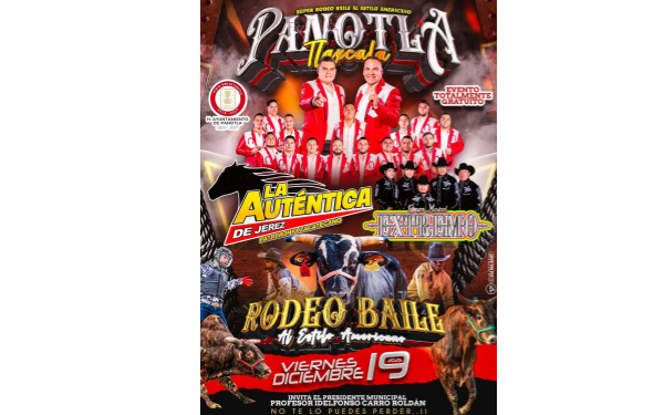 385 Grados / Panotla / REDACCIÓN / El Ayuntamiento de Panotla 2024–2027, que encabeza el presidente municipal Idelfonso Carro Roldán, invita a la ciudadanía a disfrutar de una gran noche de tradición, música y espectáculo con el Súper Rodeo Baile al Estilo Americano, que se llevará a cabo el viernes 19 de diciembre de 2025, como parte de las actividades recreativas y culturales impulsadas por el Gobierno Municipal.