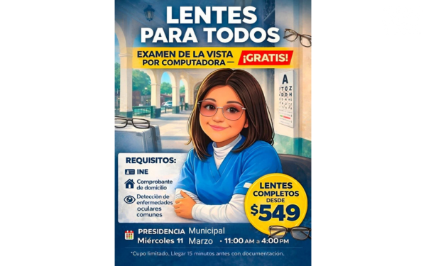 Durante esta jornada también se ofrecerán lentes completos desde 549 pesos, además de una promoción especial de tres lentes por mil 500 pesos, con el objetivo de que más personas puedan acceder a este tipo de apoyos que contribuyen a mejorar su calidad de vida.