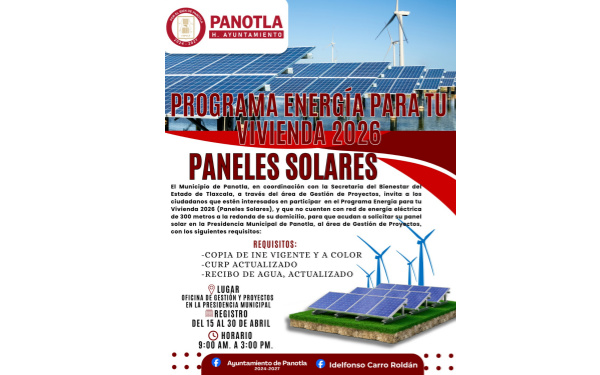 385 Grados / Panotla / REDACCIÓN / El H. Ayuntamiento de Panotla, en coordinación con la Secretaría del Bienestar del Estado de Tlaxcala y a través del área de Gestión y Proyectos, invita a la ciudadanía a formar parte del programa “Energía para tu Vivienda 2026 (Paneles Solares)”, con el objetivo de mejorar las condiciones de vida de las familias del municipio.