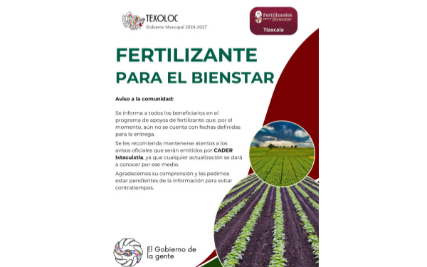 385Grados / Texoloc / REDACCIÓN / El Ayuntamiento de San Damián Texoloc informó a las y los beneficiarios del programa de fertilizante para el bienestar que, hasta el momento, no se cuenta con fechas definidas para la entrega de este apoyo.