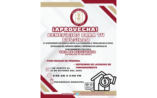 Esta iniciativa, que estará vigente del 1 de agosto al 31 de octubre de 2025, ofrece a los contribuyentes la oportunidad de gozar de un 40% de descuento en rezagos y de la condonación total de multas y recargos en refrendos de licencia de funcionamiento.