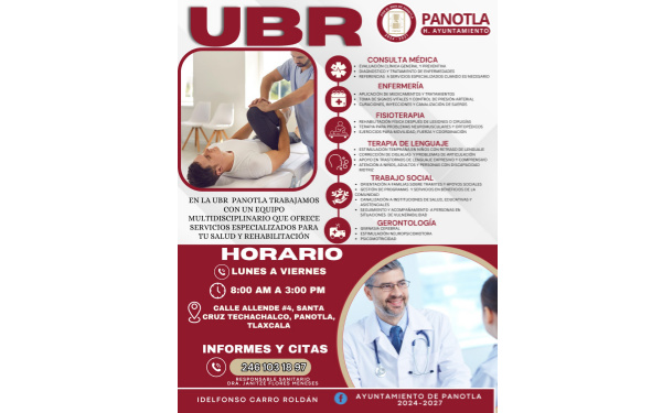 La UBR Panotla trabaja con un equipo multidisciplinario de especialistas que ofrecen servicios en consulta médica, enfermería, fisioterapia, terapia de lenguaje, trabajo social y gerontología, con el objetivo de garantizar el acceso a la salud y la rehabilitación de las y los panotlenses.