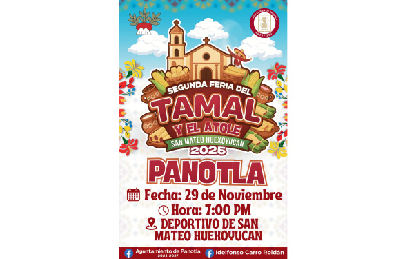 385 Grados / Panotla / REDACCIÓN / El H. Ayuntamiento de Panotla que encabeza el presidente municipal Idelfonso Carro Roldán, en coordinación con la Presidencia de Comunidad de San Mateo Huexoyucan, dirigida por el C. Arturo Sánchez Maza, invita a la ciudadanía a disfrutar de la Segunda Edición de la Feria del Tamal y el Atole 2025, que se llevará a cabo el sábado 29 de noviembre a partir de las 7:00 p.m. en la cancha deportiva de la comunidad.