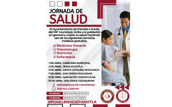 385 Grados / Panotla / REDACCIÓN / El Ayuntamiento de Panotla a través del DIF municipal invita a todos los habitantes del municipio a asistir a la Jornada de Salud, un esfuerzo conjunto para llevar atención médica para todas las edades, con el compromiso de mejorar la calidad de vida.