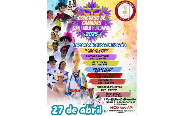 385 Grados / Panotla / REDACCIÓN / El Ayuntamiento de Panotla, que encabeza el presidente municipal Idelfonso Carro Roldán, en coordinación con la Comunidad de San Tadeo Huiloapan, tiene el honor de invitar a toda la ciudadanía al tradicional Concurso de Camadas 2025, evento que se llevará a cabo el próximo domingo 27 de abril, a partir de las 10:00 horas, frente a la presidencia de comunidad.